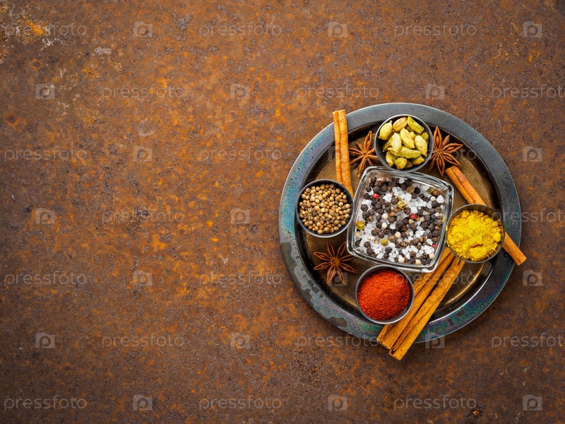 Смешайте специи на темно-коричневой ржавой металлической тарелке - семена кориандра, молотый красный перец, соль, черный перец, розмарин, куркума, карри, кориандр. Вид сверху, пустое пространство, металлический ржавый фон