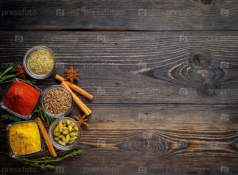 Набор специй и трав на темно-коричневом текстурированном деревянном столе. Вид сверху, пустое пространство