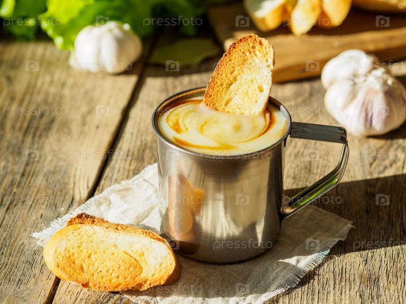 Простая диета - не жирная пища, небольшая порция крем-супа, картофельное пюре и капуста в металлической кружке, сухарики. Вид сбоку, селективный фокус, дневной свет