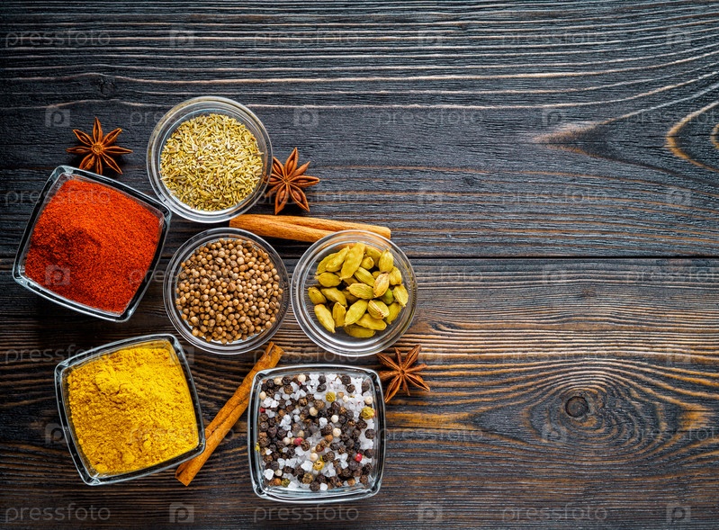 Набор специй на темно-коричневом текстурированном деревянном столе - семена кориандра, молотый красный перец, соль, черный перец, розмарин, куркума, карри, кориандр, бадьян, корица. Вид сверху, пустое место