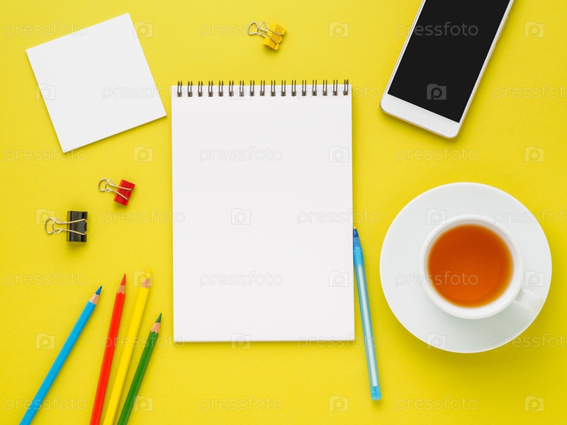 Вид сверху на современный ярко-желтый офисный стол с пустым блокнотом, чашкой чая и принадлежностями. Макет, пустое пространство