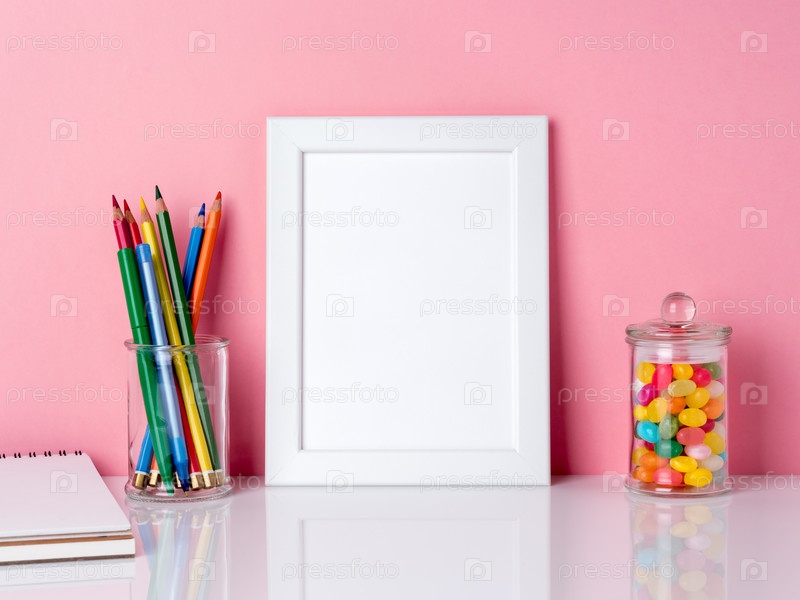Пустая белая рамка и карандаш в банке, конфеты на белом столе у розовой стены с местом для копирования