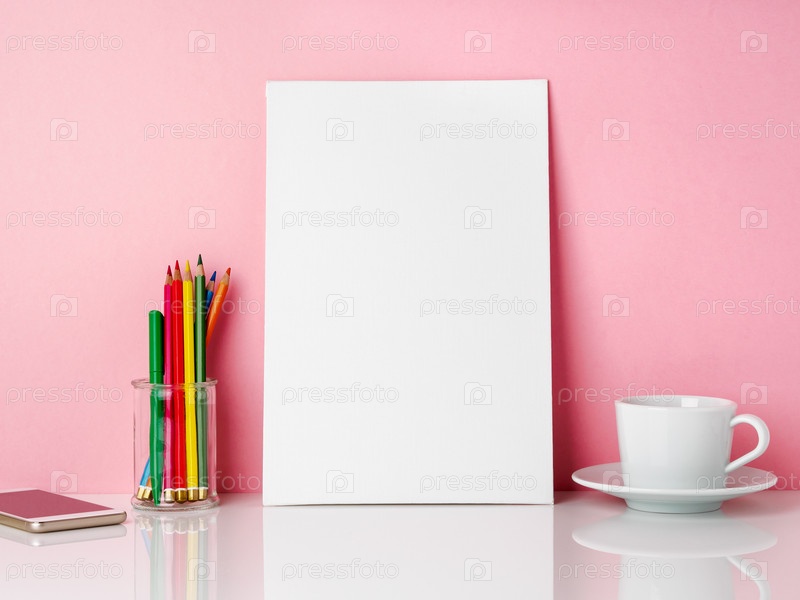 Пустая белая рамка и карандаш в банке, чашка кофе или чая на белом столе у розовой стены с местом для копирования