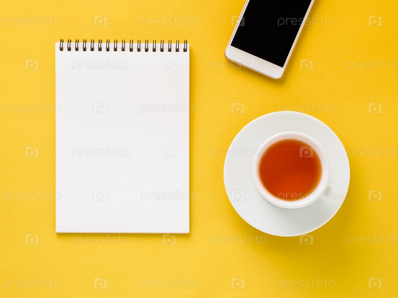 Вид сверху на современный ярко-желтый офисный стол с пустым блокнотом, чашкой чая, смартфоном. Макет, пустое пространство