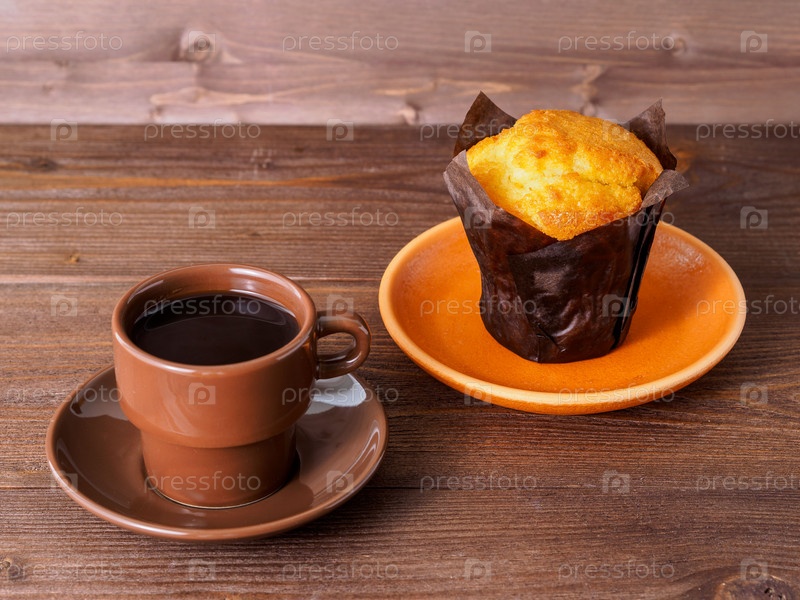 Горячий кофе в чашке на блюдце, сладкий вкусный кекс, на коричневом деревянном фоне, вид сбоку