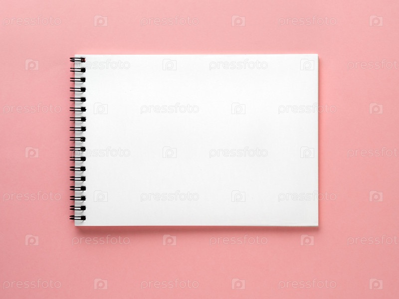 Пустая белая страница блокнота на розовом столе, цветной фон. Вид сверху, плоская планировка