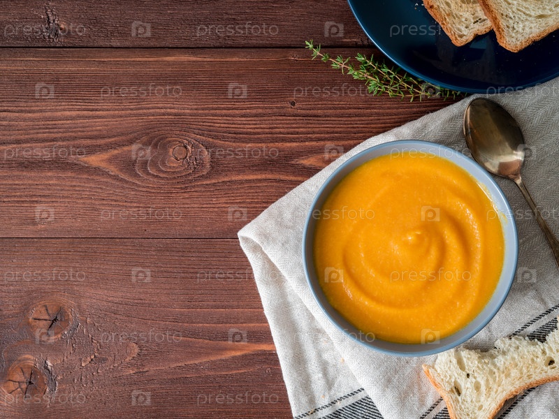 Диетический вегетарианский суп-пюре из тыквы, на темно-коричневом деревянном столе, вид сверху, место для копирования