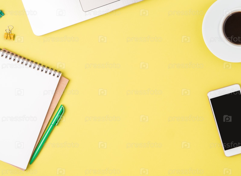 Вид сверху современного ярко-желтого офисного стола с пустым блокнотом, компьютером, смартфоном. Макет, пустое пространство