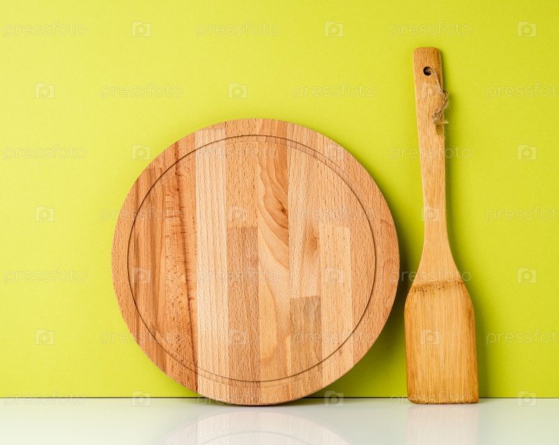 Деревянная лопатка и деревянная круглая разделочная доска, на белом столе около яркой желто-зеленой или оливковой стены. Концепция меню, рецепты