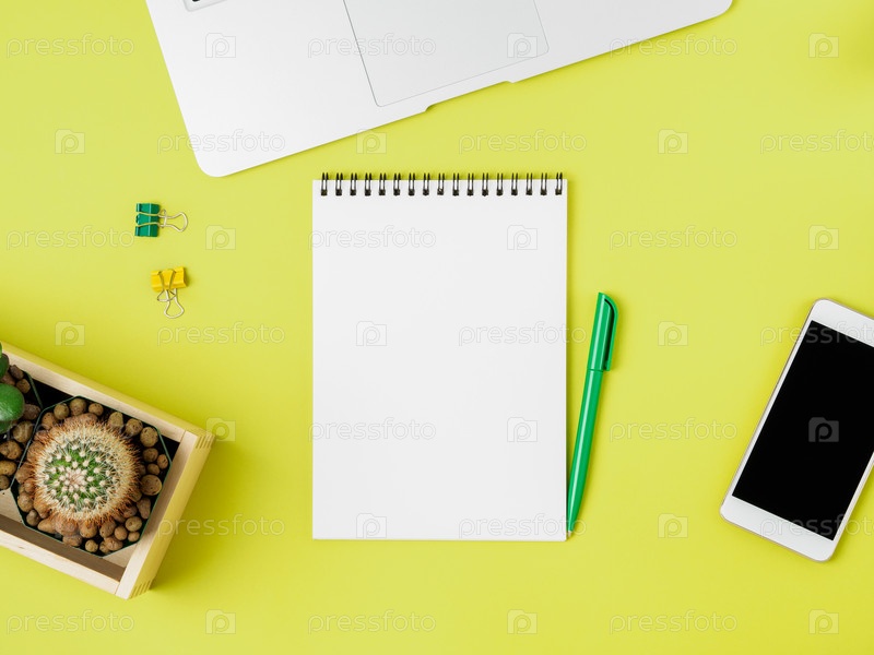 Вид сверху современного ярко-желтого офисного стола с пустым блокнотом, компьютером, смартфоном. Макет, пустое пространство