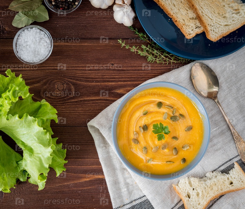Диетический вегетарианский суп-пюре из тыквы, на темно-коричневом деревянном столе, вид сверху, крупный план