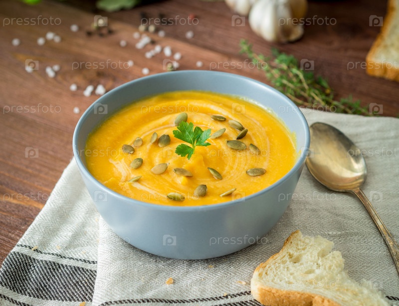 Диетический вегетарианский суп-пюре из тыквы, на темно-коричневом деревянном столе, вид сбоку, крупный план