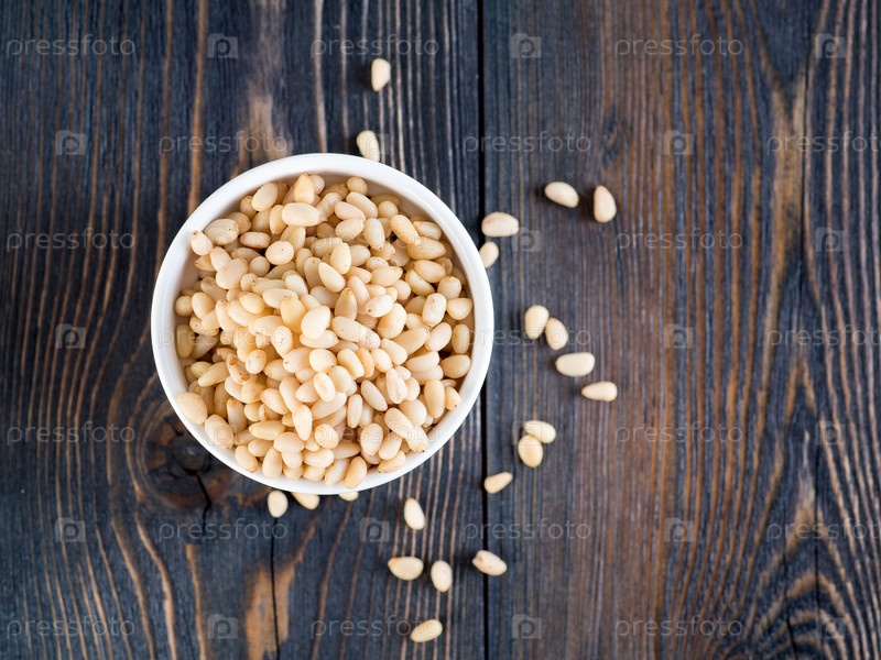 Вид сверху на белые чашки, миски с горстью кедровых орехов, кедровые орехи на деревянном фоне