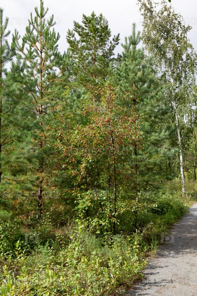 Осенний пейзаж леса с дорогой и рябиной летом
