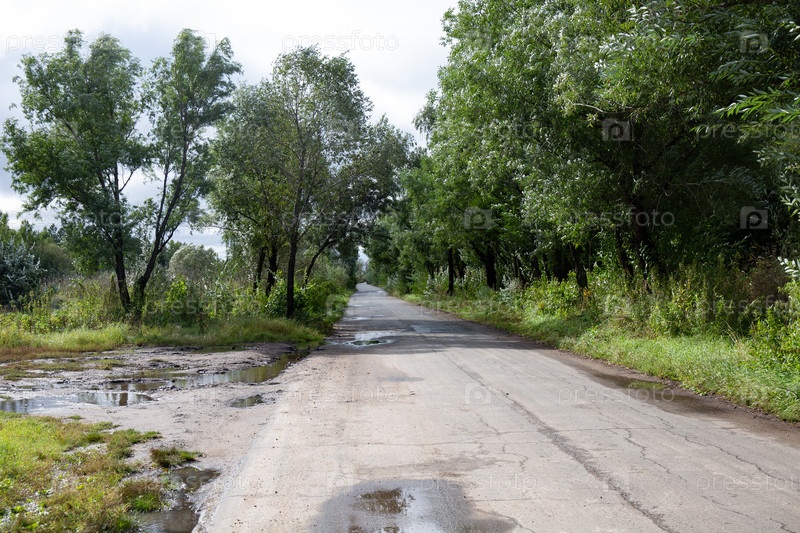 Сельская дорога в лесу. Летний пейзаж с дорогой и деревьями в Парке Победы города Омска летом