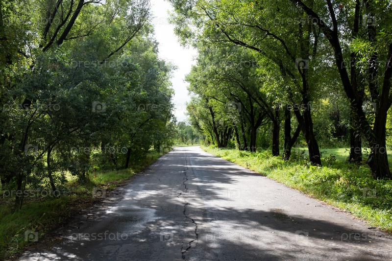 Сельская дорога в лесу. Летний пейзаж с дорогой и деревьями в Парке Победы города Омска летом