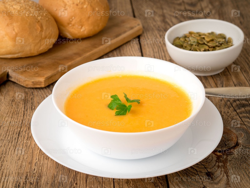 Белая миска тыквенного супа, украшенная петрушкой на деревянном фоне, вид сбоку