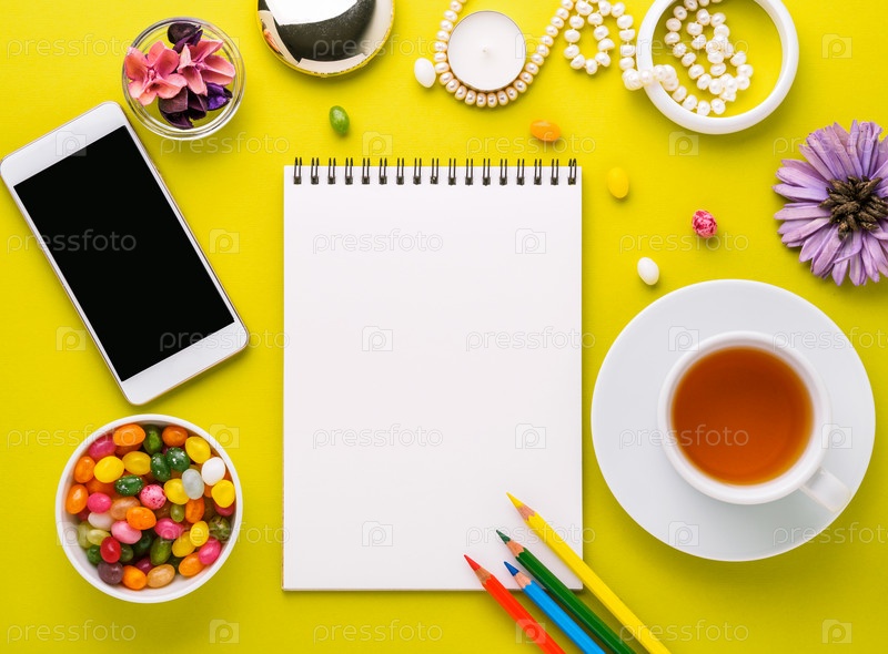 Уютный уголок для девушки с блокнотом, смартфоном, цветами, украшениями и сладостями. Рабочий стол для творчества, идей, креатива, мечтаний. Яркий желтый фон, вид сверху, плоская планировка, пустое место для текста