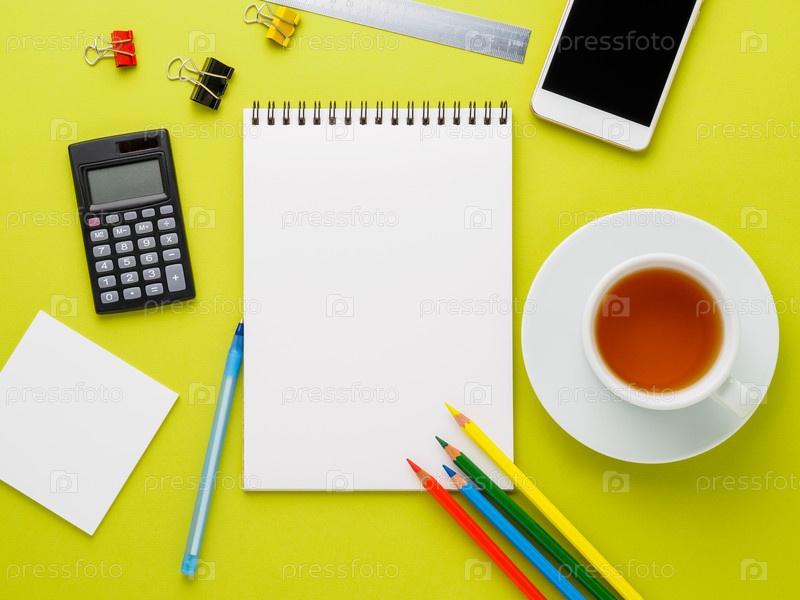 Вид сверху на современный ярко-желтый офисный стол с пустым блокнотом, чашкой чая и принадлежностями. Макет, пустое пространство