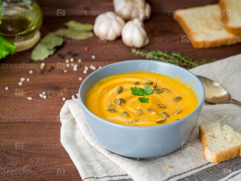 Диетический вегетарианский суп-пюре из тыквы, на темно-коричневом деревянном столе, вид сбоку, крупный план