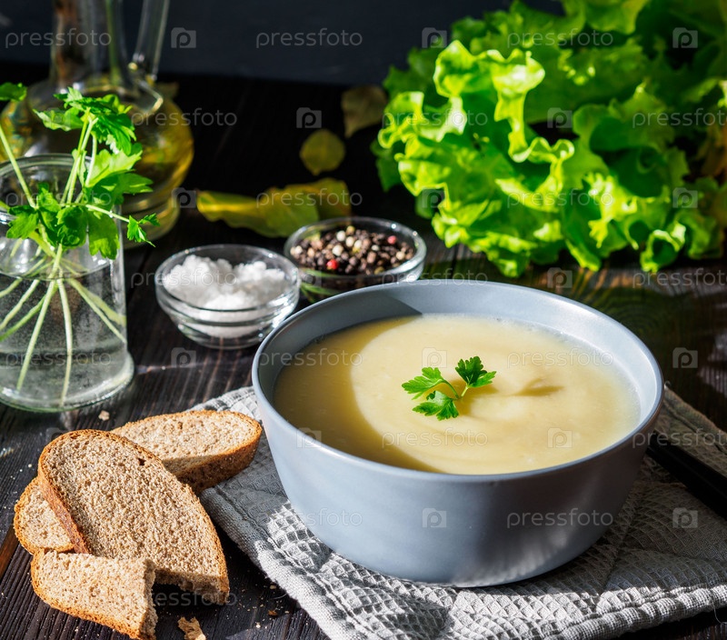 Диетический вегетарианский суп-пюре из сливок, с картофелем и цветной капустой, на темно-коричнево-синем деревянном столе, вид сбоку, крупный план