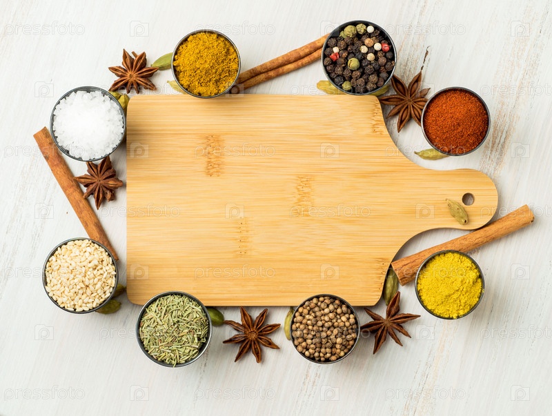 Различные индийские специи в металлических чашках. Пустая деревянная доска, приправа на белом деревянном столе. вид сверху, место для текста