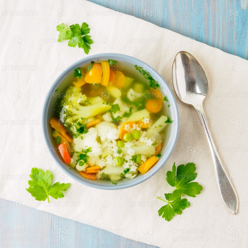 Яркий весенний овощной диетический вегетарианский суп с цветной капустой, брокколи, перцем, морковью, зеленым горошком, пастой, петрушкой. Вид сверху, синий фон