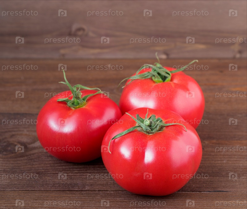 Три спелых свежих красных помидора на деревянном коричневом фоне