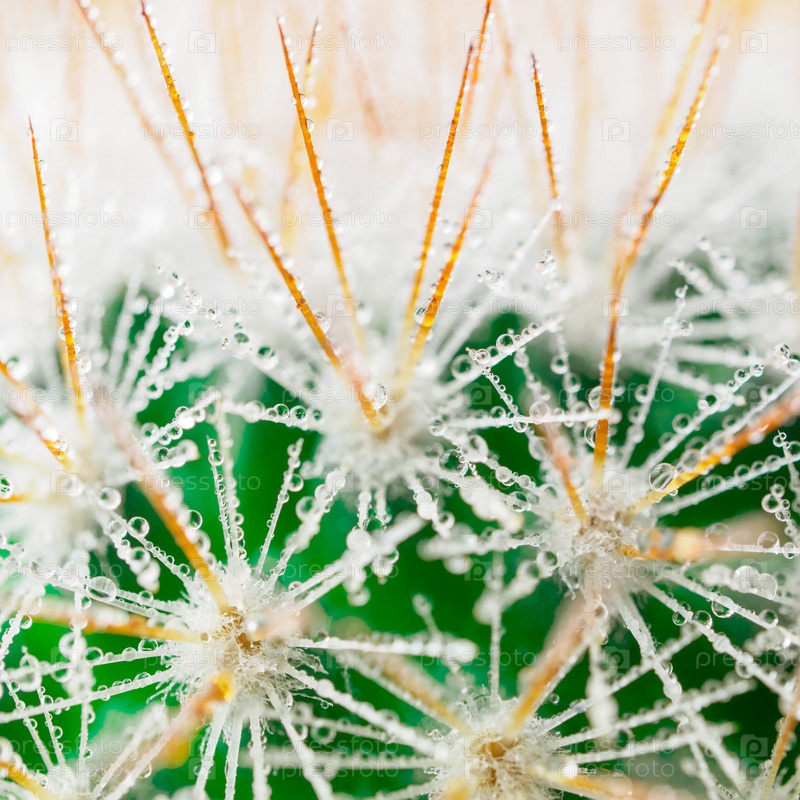 Длинные иглы суккулента, капли воды или росы на колючках кактуса, макро, крупный план