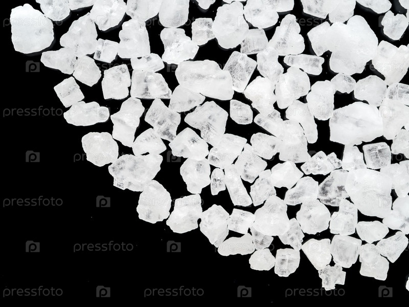 Крупные белые кристаллы морской соли на черном фоне, крупный план, вид сверху