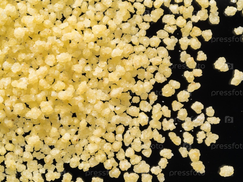 Сырые сухие зерна кускуса на черном фоне, крупный план, вид сверху