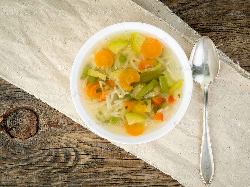 Яркий весенний овощной диетический вегетарианский суп, льняная салфетка, вид сверху, деревянный фон