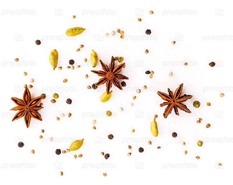 Набор специй на белом фоне, вид сверху. ароматные приправы с анисом и кардамоном