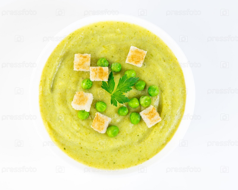 Большая белая миска с крем-супом из брокколи, картофеля и зеленого горошка на белом фоне, вид сверху