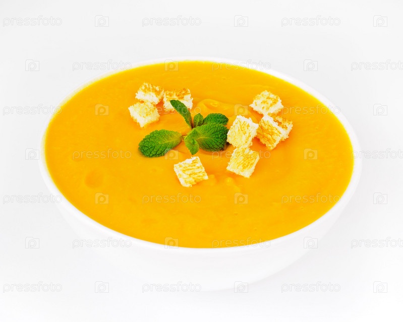 Большая белая миска с тыквенным супом-пюре на белом фоне. Яркое вкусное блюдо, вид сбоку