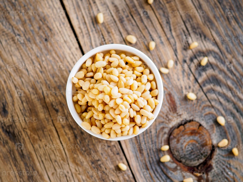 Вид сверху на белые чашки, миски с горстью кедровых орехов, кедровые орехи на деревянном фоне