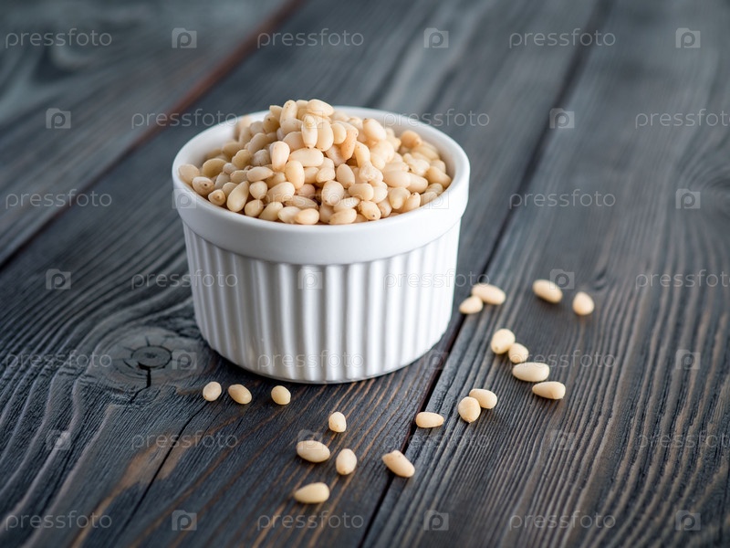 Вид сбоку на белые чашки, миски с горстью кедровых орехов, кедровые орехи на деревянном фоне