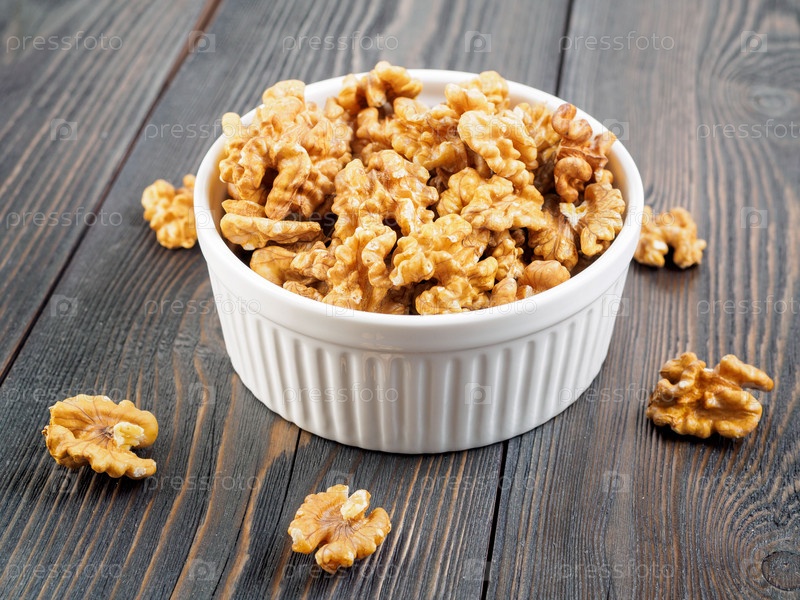 Вид сбоку: белая миска с горстью грецких орехов, черкесских орехов на темном деревянном фоне