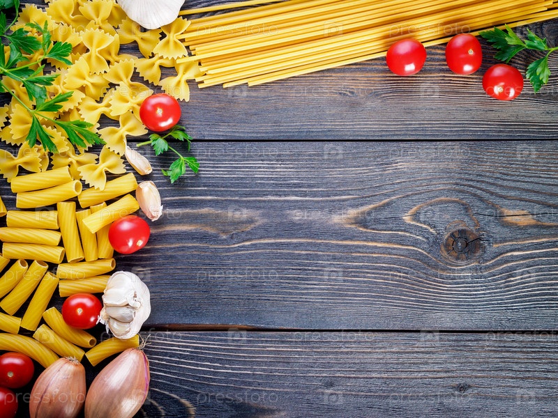 Паста, помидоры, лук-шалот, чеснок, петрушка на темном деревянном фоне, вид сверху, место для копирования