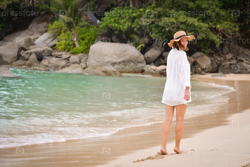 Девушка в белой рубашке и шляпе гуляет по пляжу