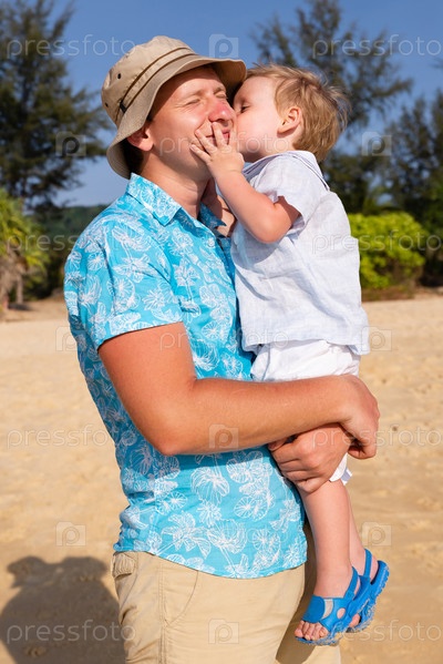 Маленький мальчик целует папу в щеку на пляже