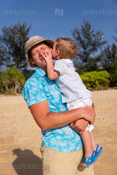 Маленький мальчик целует папу в щеку на пляже