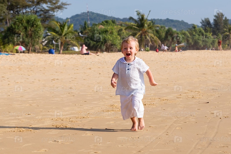 Маленький светловолосый мальчик бежит по воде вдоль морского пляжа