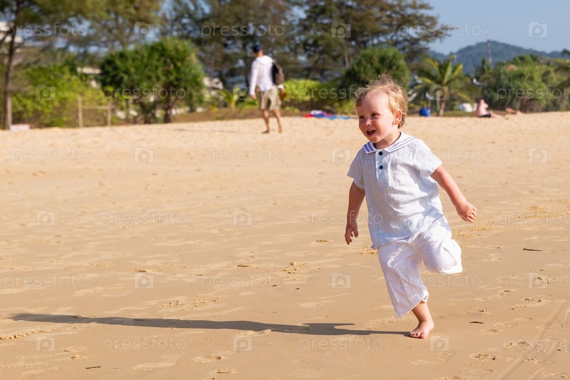 Маленький светловолосый мальчик бежит по воде вдоль морского пляжа