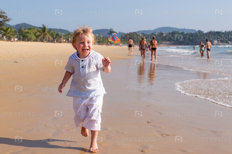 Маленький светловолосый мальчик бежит по воде вдоль морского пляжа