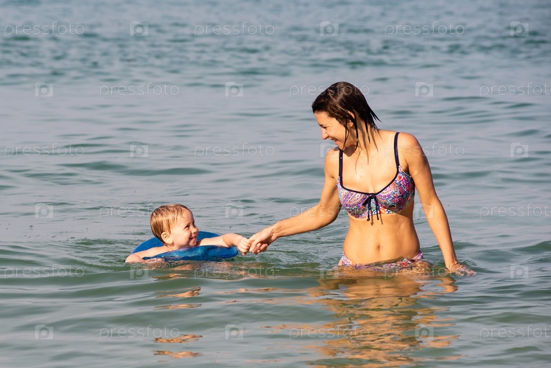 Молодая мать плавает с сыном в море