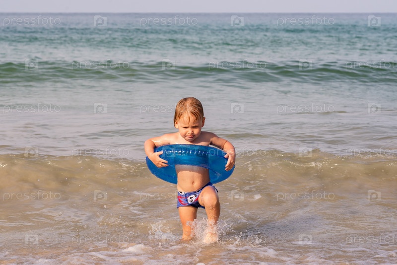 Счастливый маленький мальчик бегает и играет с волнами на пляже
