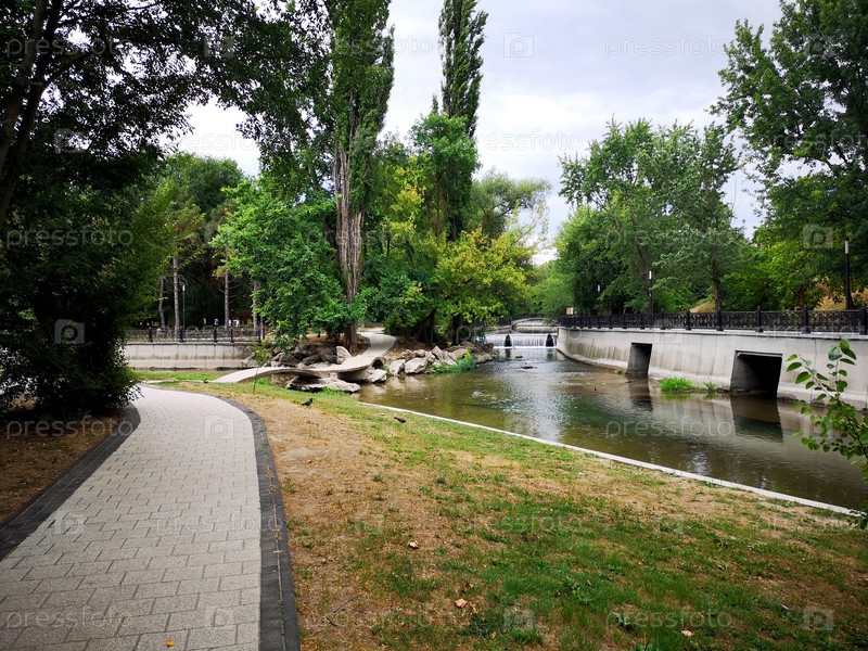 Спокойная прибрежная тропа, окруженная деревьями и зеленью, в пасмурный день в городском парке