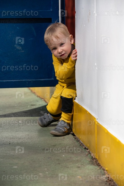 Мальчик в модном теплом спортивном желтом костюме позирует для портрета. Красивый ребенок стоит на улице спортивной площадки. Детская спортивная одежда и мода