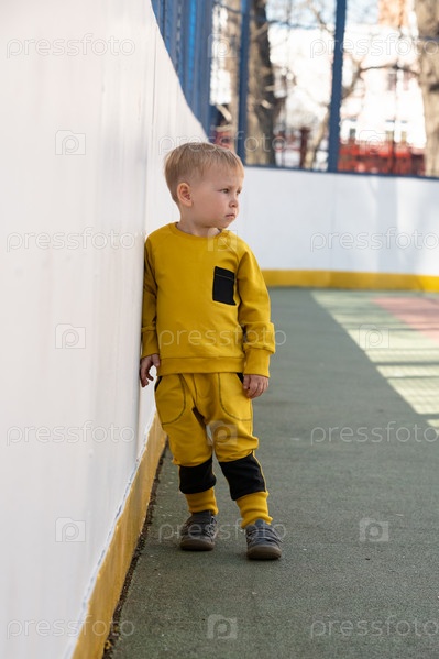 Мальчик в модном теплом спортивном желтом костюме позирует для портрета. Красивый ребенок стоит на улице спортивной площадки. Детская спортивная одежда и мода